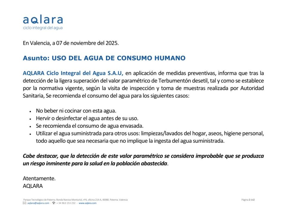 En fecha 7 de noviembre de 2025, la empresa gestora del suministro, AQLARA Ciclo Integral del Agua S.A.U., ha informado de una ligera superación en uno de los parámetros de control del agua de consumo humano detectada durante una inspección sanitaria rutinaria.